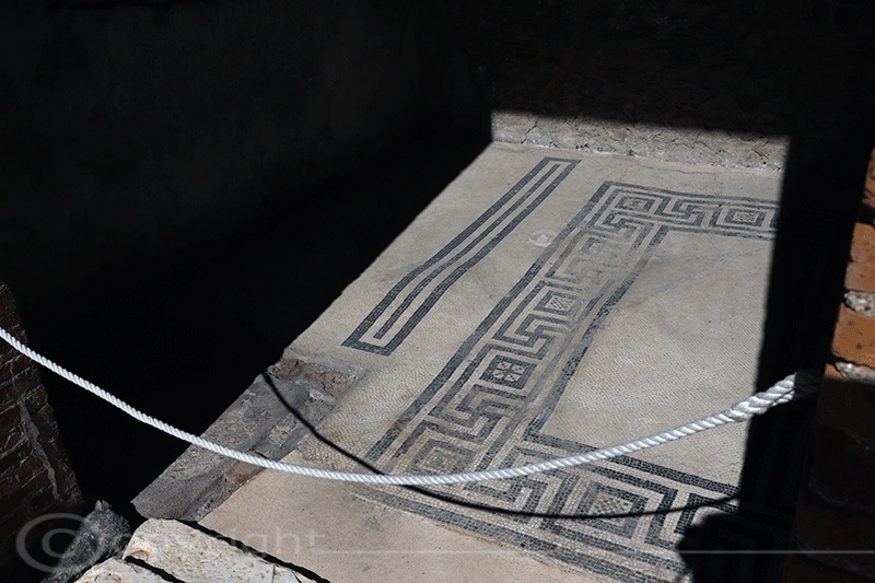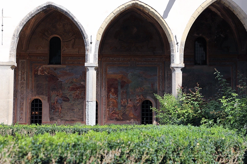 Pfeiler und Bänke sind mit handbemalten Kacheln dekoriert. Ihre bunten und intensiven Farben greifen Motive des Golfs von Neapels auf. Gelbe Zitronen, grüne Weinreben und blaue Landschaften in einem Meer aus Farben. Bänke laden zum Platz nehmen ein um die herrliche Ruhe mitten in der lebendigen Altstadt zu genießen. Die Wände des Kreuzgangs sind mit Fresken aus dem 17. Jh. dekoriert, auf denen Heilige und Szenen aus dem alten Testament dargestellt werden.