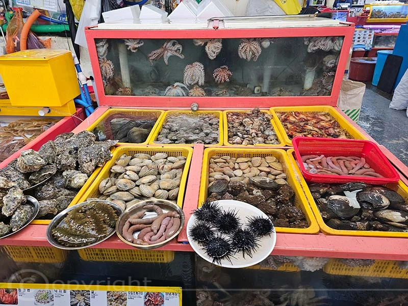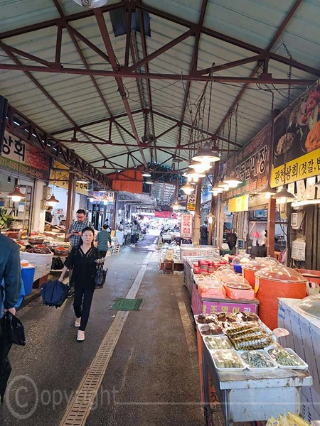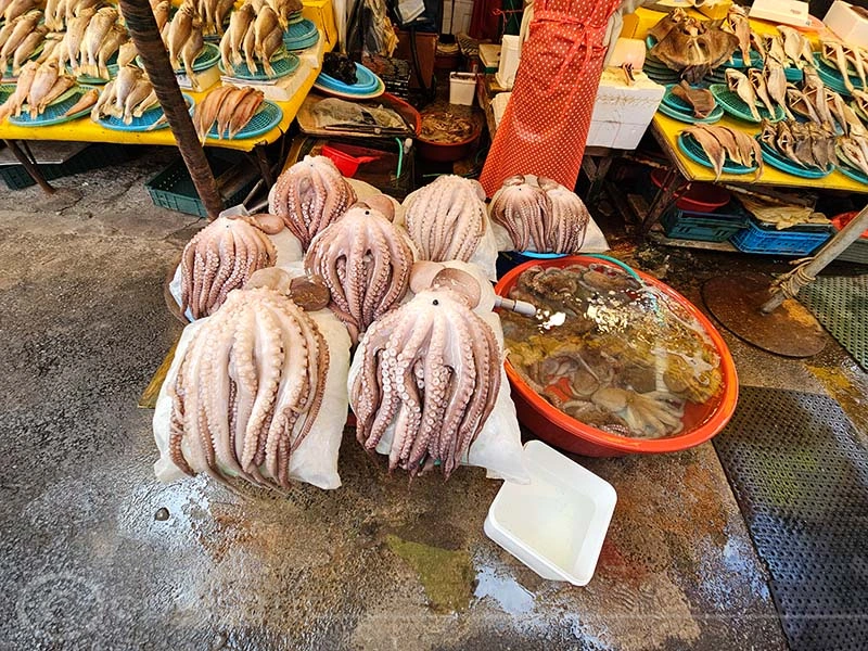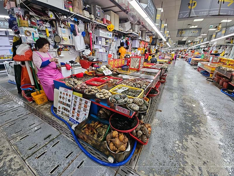 Der Jagalchi-Fischmarkt in Busan ist ein geschäftiges Zentrum, das eine große Vielfalt an Fisch und Schalentieren anbietet. Der Markt erstreckt sich sowohl über überdachte Hallen als auch über Außenbereiche mit zahlreichen kleinen Ständen, an denen frischer Fang sowie getrocknete Meeresfrüchte verkauft werden. Die leuchtenden Farben der frischen Fische und Schalentiere sind ein besonderer Blickfang. Ein besonderes Highlight ist die Möglichkeit, den gekauften Fisch direkt zubereiten zu lassen und ihn in den darüber gelegenen Restaurants zu verzehren.
