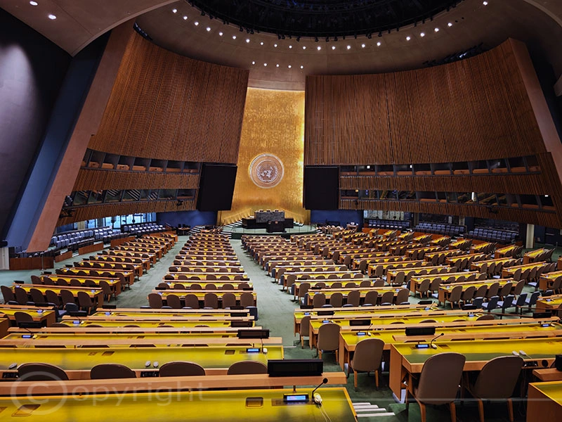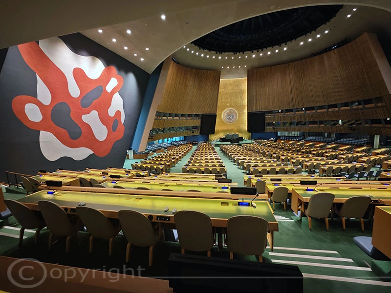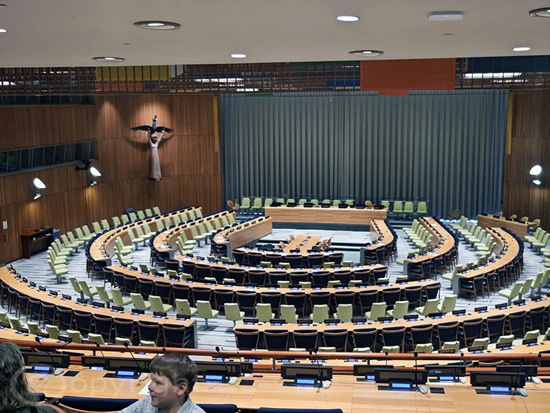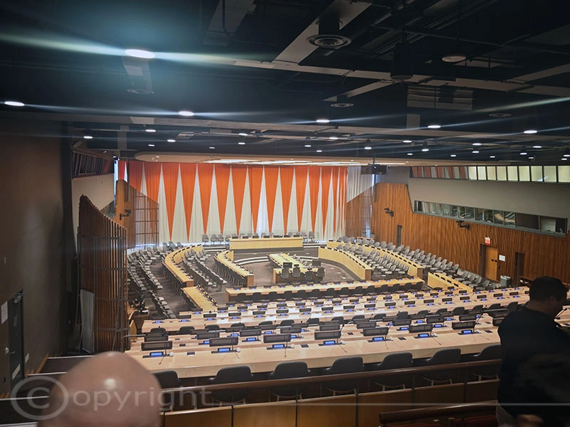 Wir nutzten die Gelegenheit, im Rahmen einer Führung das UN-Hauptquartier zu besichtigen. Nach einer Online-Registrierung und einem Sicherheitscheck wie am Flughafen hielten wir schließlich unsere Besucherausweise in den Händen. Die Führung erwies sich als spannend und abwechslungsreich. Im Gebäude sind zahlreiche Kunstwerke zu sehen, während die Sitzungssäle etwas in die Jahre gekommen sind und nicht besonders einladend wirken.