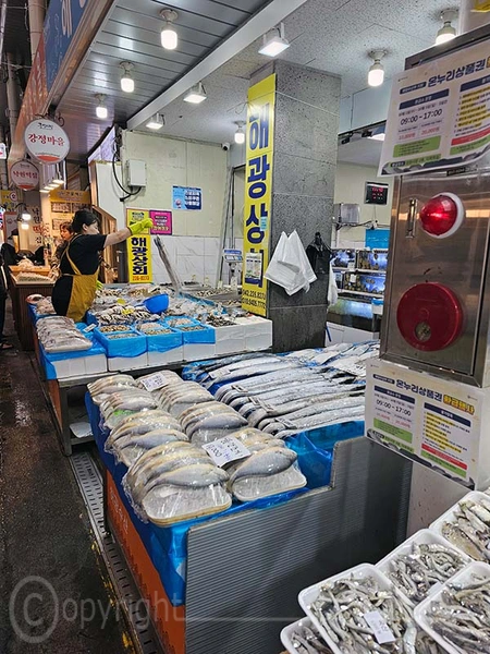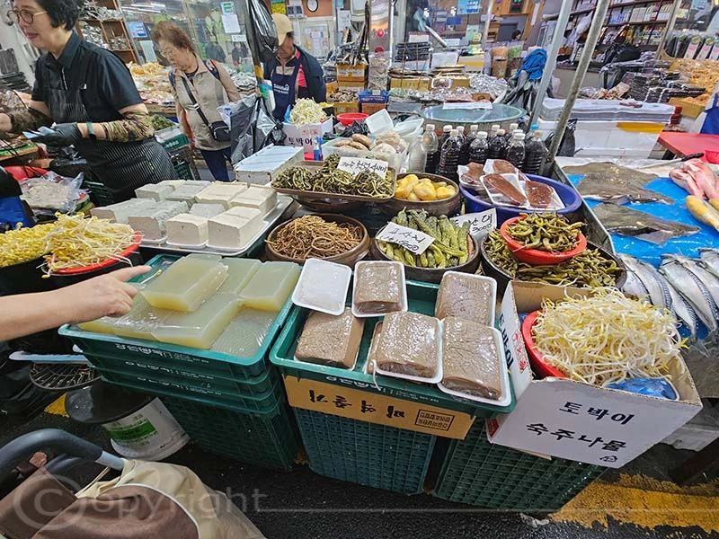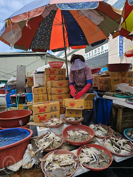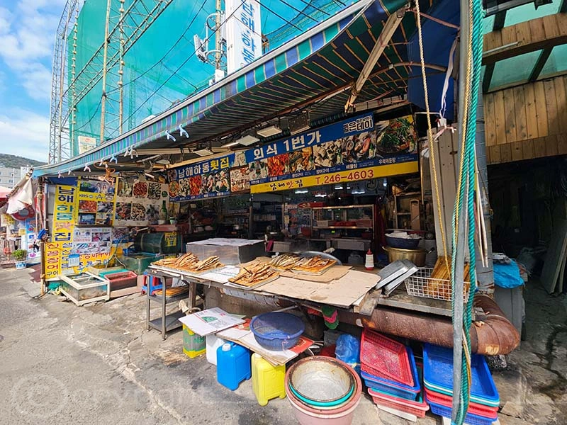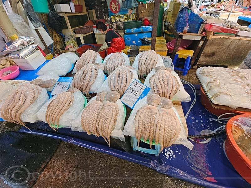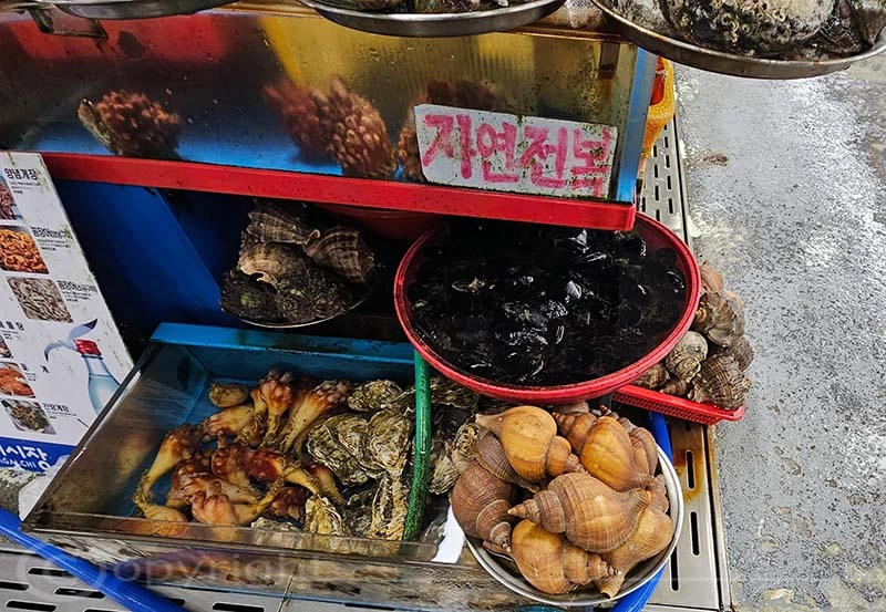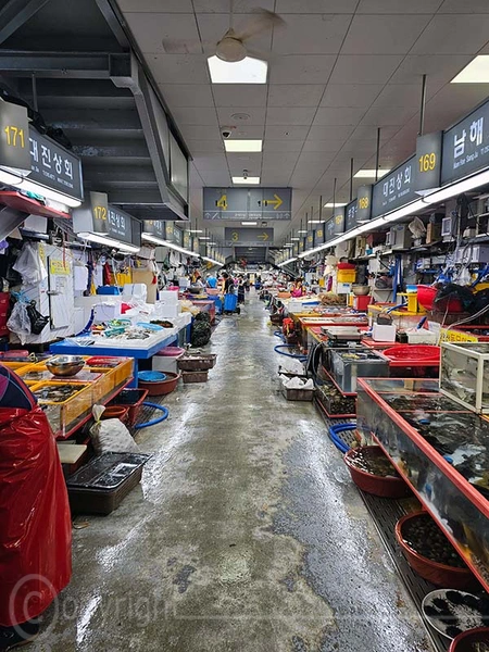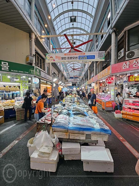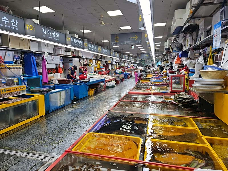 Der Jagalchi-Fischmarkt in Busan ist ein geschäftiges Zentrum, das eine große Vielfalt an Fisch und Schalentieren anbietet. Der Markt erstreckt sich sowohl über überdachte Hallen als auch über Außenbereiche mit zahlreichen kleinen Ständen, an denen frischer Fang sowie getrocknete Meeresfrüchte verkauft werden. Die leuchtenden Farben der frischen Fische und Schalentiere sind ein besonderer Blickfang. Ein besonderes Highlight ist die Möglichkeit, den gekauften Fisch direkt zubereiten zu lassen und ihn in den darüber gelegenen Restaurants zu verzehren.